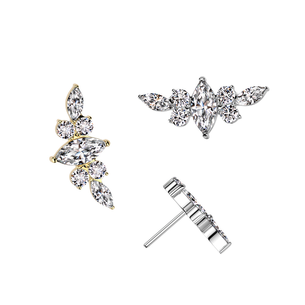 A statement of elegance in motion. The Aurora Wing features a luminous marquise-cut cubic zirconia framed by sparkling rounds, forming a wing-like silhouette that flows gracefully along the ear. Its design catches the light beautifully, adding just the right amount of brilliance to a curated look or standing out all on its own.