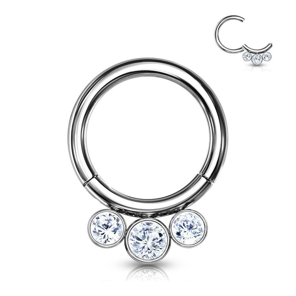Elevate your piercing with this beautiful implant-grade titanium clicker ring, set with three sparkling cubic zirconia stones — a larger centre gem framed by two smaller side stones. Made from solid ASTM F-136 titanium, it’s lightweight, nickel-free, and safe for even the most sensitive skin, making it perfect for both fresh and healed piercings.